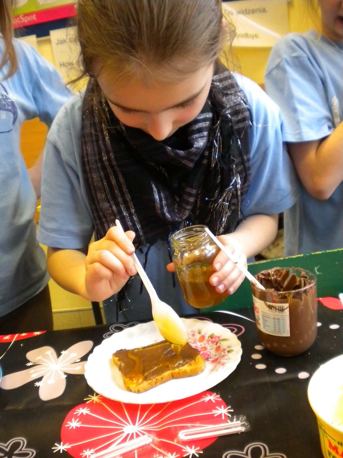 Honey, strawberry jam and chocolate spread.Yummy, yummy, yummy!